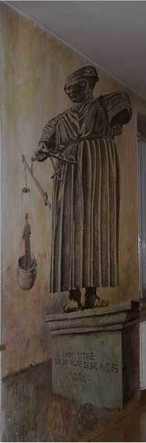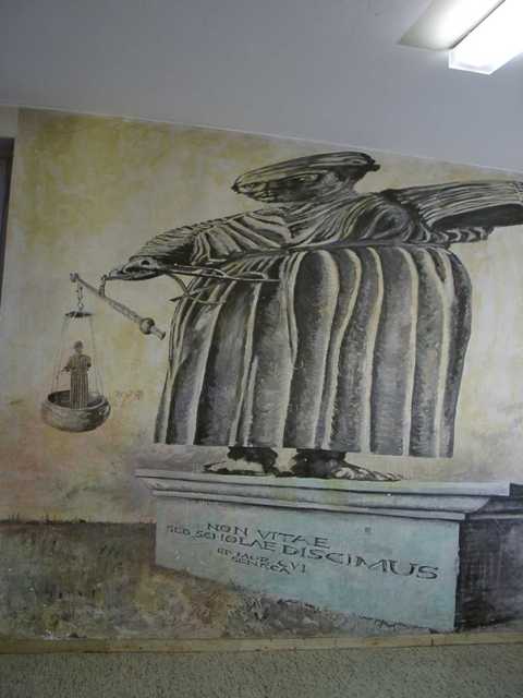 Verzerrbild, angebracht an der Wand. Nur von einem bestimten Blickpunkt aus betachtet stimmen die Bildrelationen.Entstanden in den 80'ern, zusammen mit seinen Schülern und Referendaren.