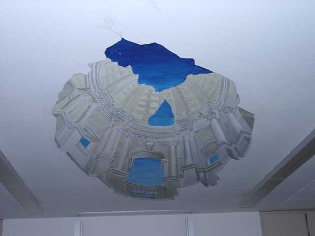 Verzerrbild, angebracht an der Decke eines Klassenzimmers. Nur von einem bestimten Blickpunkt aus betachtet stimmen die Bildrelationen.Entstanden in den 80'ern, zusammen mit seinen Schülern und Referendaren.