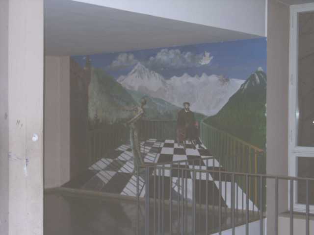 Nur von einem bestimten Blickpunkt aus betachtet stimmen die Bildrelationen. Entstanden in den 80'ern, zusammen mit seinen Schülern und Referendaren.